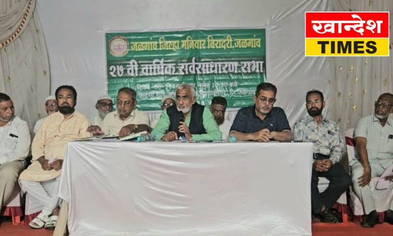 जळगाव: जळगाव जिल्हा मनियार बिरादरीची २७ वी वार्षिक सर्वसाधारण सभा मुक्ताईनगर येथील अक्सा हॉलमध्ये अध्यक्ष फारुक शेख यांच्या अध्यक्षतेखाली नुकतीच पार पडली. या सभेत विविध १५ ठराव एकमताने मंजूर करण्यात आले. समाजाच्या प्रगतीसाठी महत्त्वपूर्ण ठरणाऱ्या या सभेला जिल्ह्यातील पदाधिकारी आणि नागरिक मोठ्या संख्येने उपस्थित होते. सभेचे संचालन संस्थेचे सचिव अजिज सर यांनी केले.