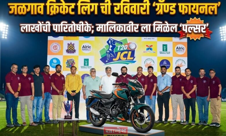 जळगाव प्रतिनिधी कांताईनगर येथील जैन ड्रीम स्पेसेसच्या मैदानावर सुरू असलेल्या जळगाव क्रिकेट लिगचा महासंग्रामाची ग्रॅण्ड फायनल रविवारी दि.२६ रोजी होणार आहे. रात्री ७.३० वाजेपासून सामन्याला सुरवात होईल. सामना संपल्यानंतर लाखोंची पारितोषिके पालकमंत्री गुलाबराव पाटील, जिल्हाधिकारी रोहन घुगे, मुंबईचे मयंक पारिख, जैन इरिगेशनचे अध्यक्ष अशोक जैन, जळगाव जिल्हा क्रिकेट असोसिएशनचे अध्यक्ष अतुल जैन व सर्व पदाधिकारी, तसेच जळगाव क्रिकेट लीग चे सर्व सहकारी व संघ मालकांसह मान्यवरांच्या हस्ते वितरीत करण्यात येणार आहे. संपूर्ण जेसीएल मध्ये मालिकावीर ठरणाऱ्या खेळाडूला पगारिया ऑटो तर्फे ‘पल्सर’ बाईक दिली जाणार आहे.